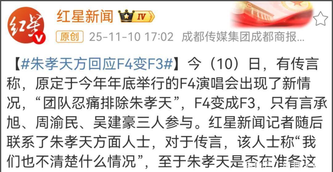 最近,台媒爆料称“F4变F3”,朱孝天被踢出局,随后深信音乐阐述此音信,引起网友热议。对此朱孝天方回复称“咱们也不领悟是什么情况”,被问到是否在准备团体演唱会也不便捷浮现。朱孝天本东说念主在新公司开业仪式上还内涵,说“扬弃了一些不好的事”,而其实早在F4刚合体的时间,朱孝天就显出折柳群来了。